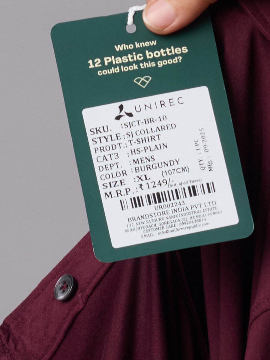 Our Burgandy Feather Touch Polo T-shirt for men is a perfect example of sustainable fashion. The t-shirt is crafted with high-performance, recycled plastic fabric that offers unmatched durability, lightweight design, and exceptional moisture-wicking properties. This makes it an ideal choice for both casual and rugged terrains. You can elevate your style with this amazing matte polo t-shirt in burgandy color that is both fashionable and eco-friendly.