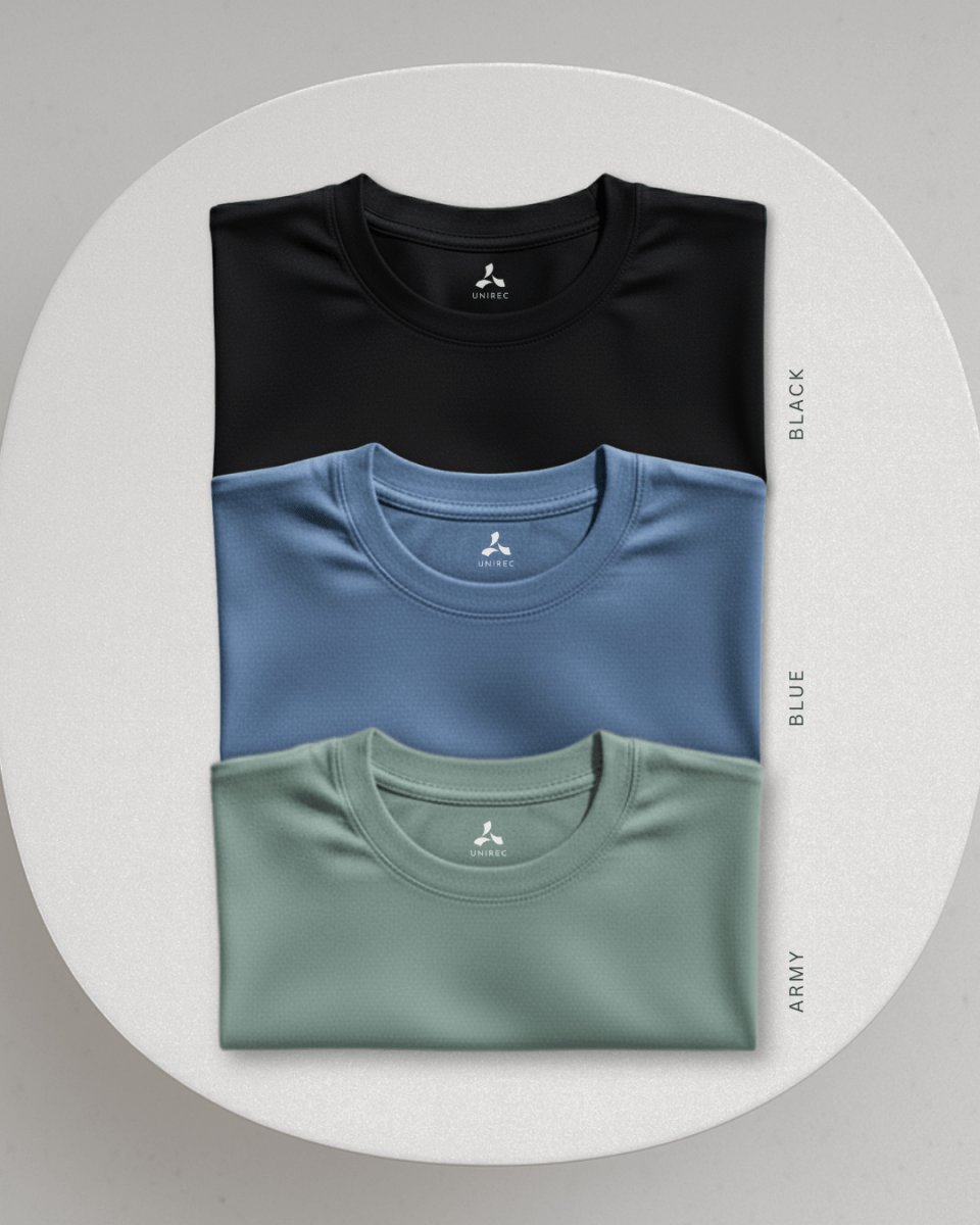 Upgrade your essentials with the Feather Touch Round Neck Combo in three unique colors, Black, Blue and Army from UNIREC. Crafted from 90% recycled PET bottles and 10% spandex, this eco-friendly duo transforms 12 bottles into soft, lightweight, and durable t-shirts. Enjoy excellent moisture-wicking properties, non-toxic dyes, and a comfortable fit—ideal for everyday wear or rugged adventures. Look stylish and feel great while making a positive impact on the planet. Choose fashion that truly cares for the Earth!